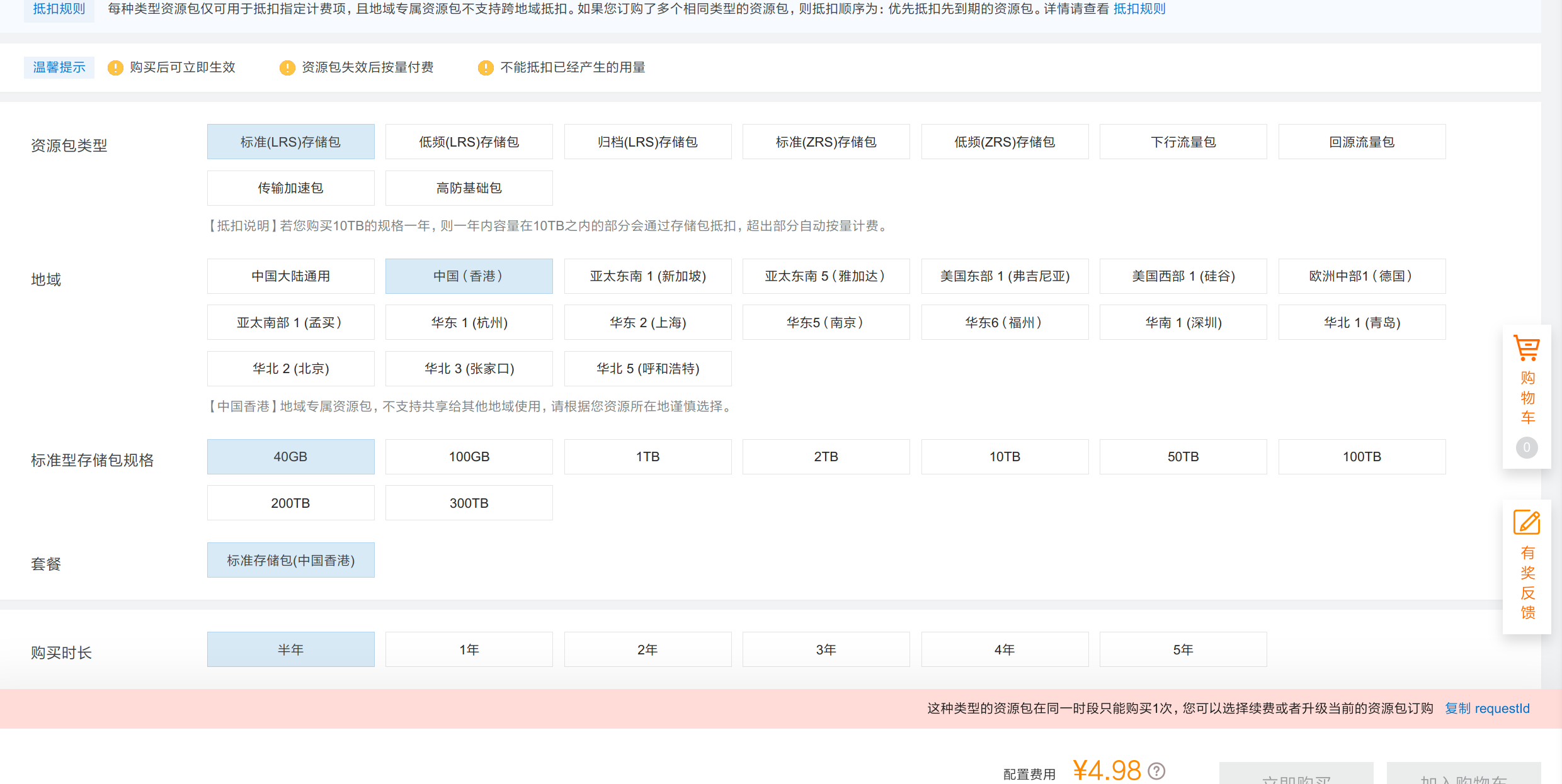 购买资源包,地域选择香港🇭🇰,其他默认即可,半年5块钱40G,还是挺便宜的。