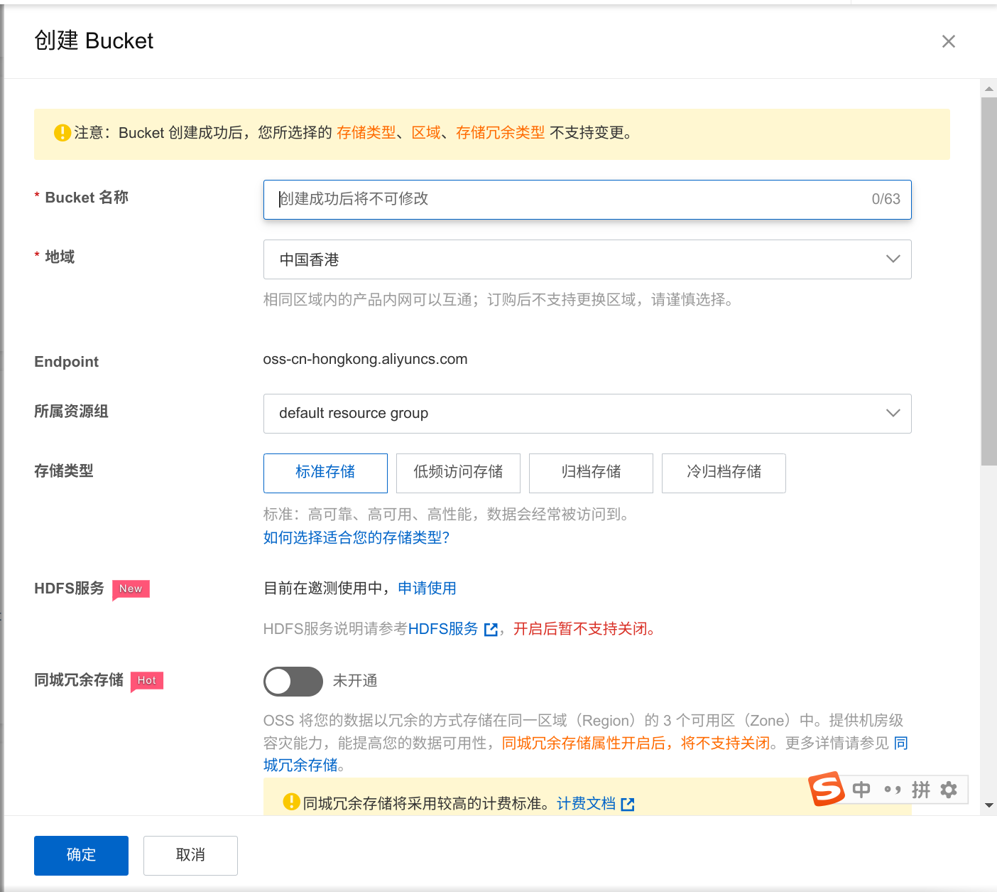 然后创建bucket,地域选香港,权限选择公共读。