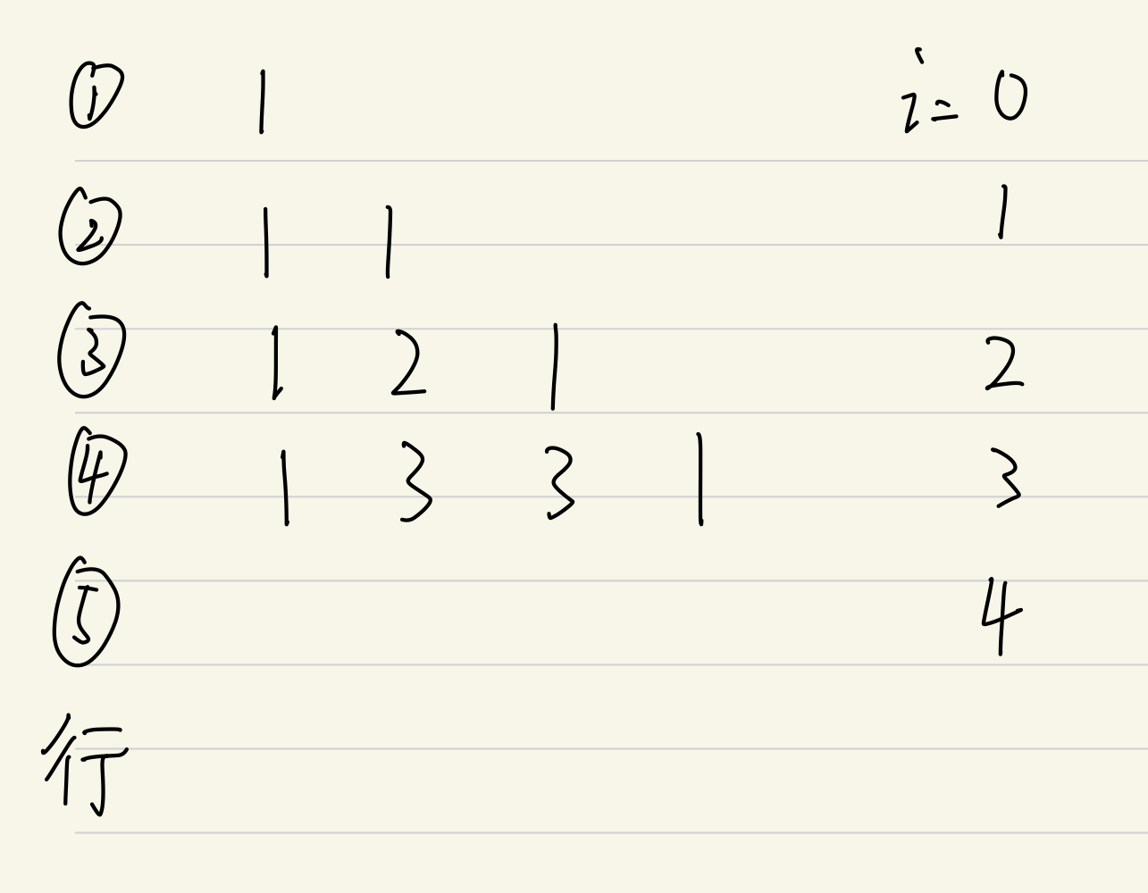 此时,数组第0项为1,第一行已经输出了