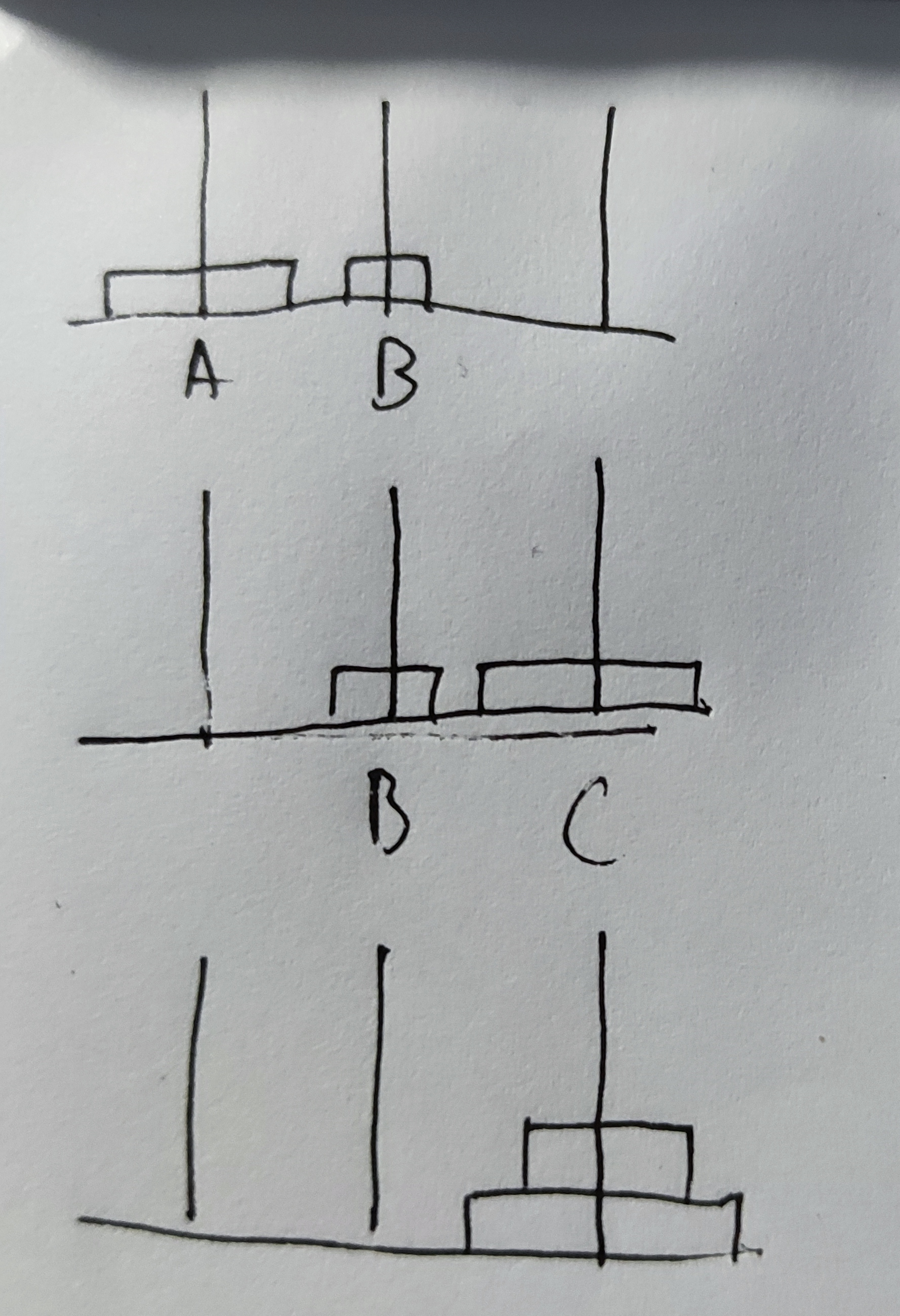 现在A有2个片了,因为大的必须要在下面,所以首要任务是把A底下的移到C去,但是小的那一个必须先动,才能移动大的。移动小的,就成了一阶的问题了,只不过,C要被大的占用,所以小片片的目标柱子成了B